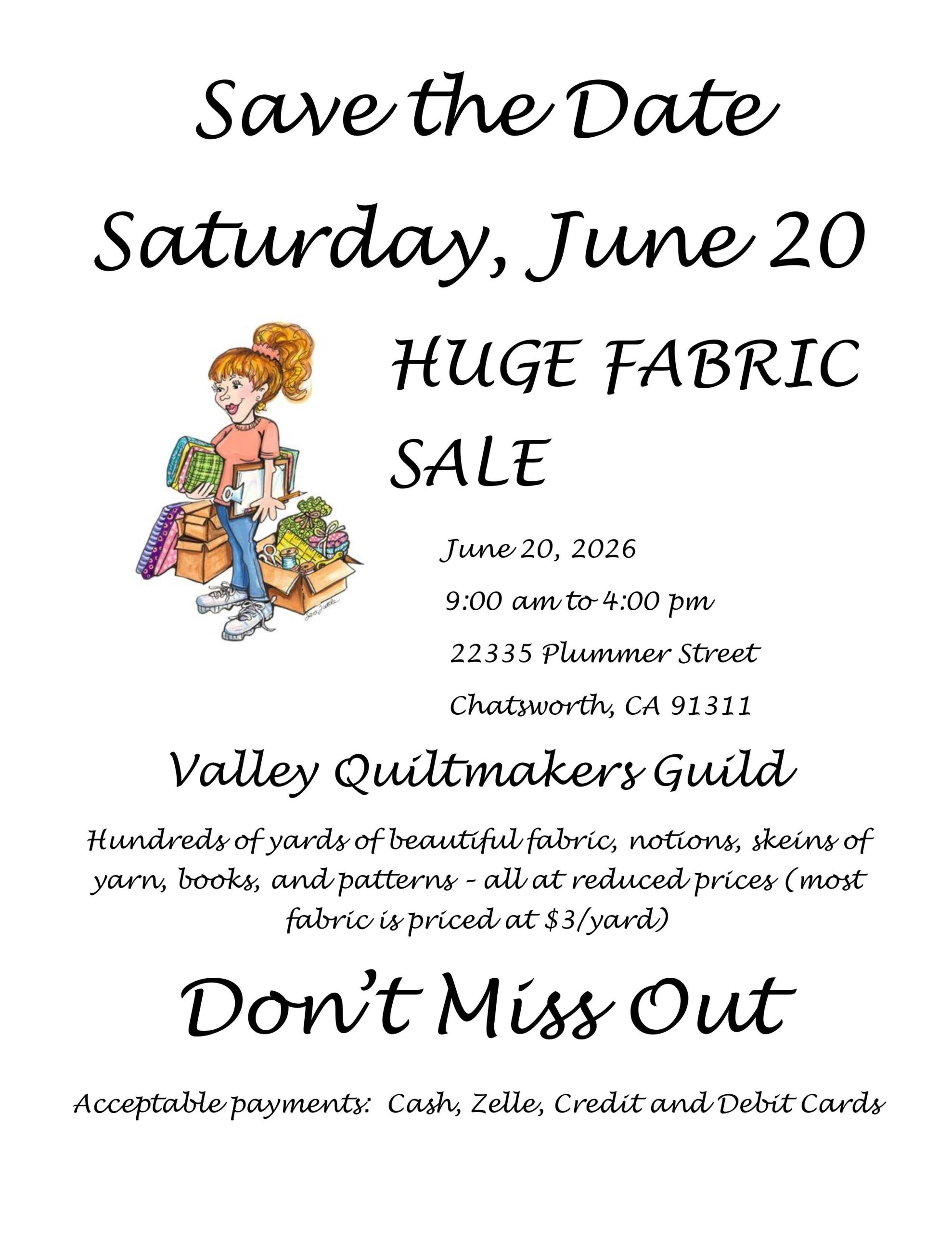 Mark your calendars. Valley Quiltmakers Guild and San Fernando Quilt Association will once again be joining forces to present a boutique and quilt show. Quilting in the Valley presents “Peace by Piece, A celebration of Quilts” one day only on May 2, 2026 from 10am to 4pm. The show will take place at Prince of Peace Episcopal Church at 5700 Rudnick Avenue in Woodland Hills. For the $10 admission, there will be quilts on display as well as a boutique. Hope to see everyone there.